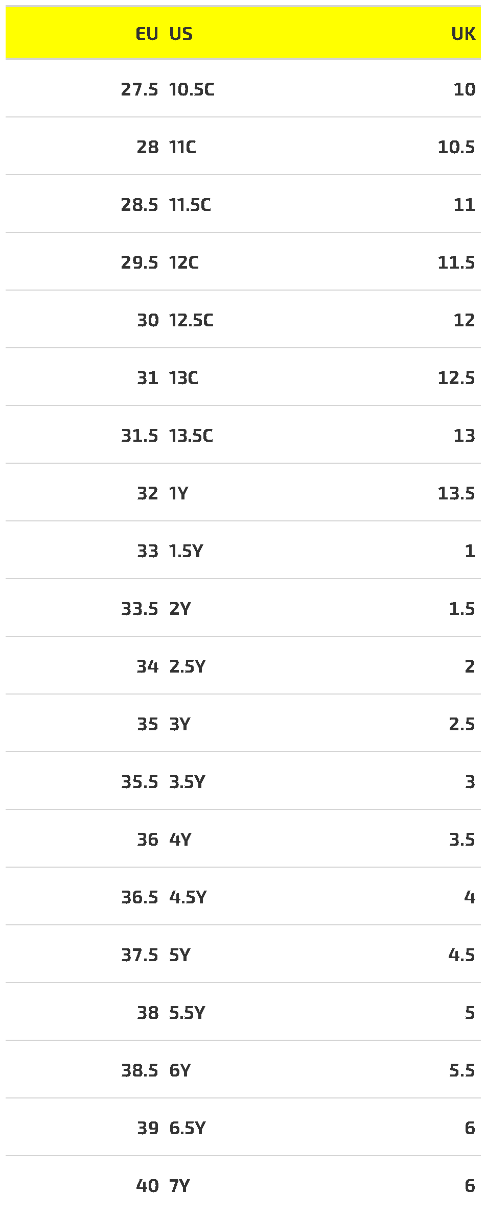 Находим Вашу длину стопы в крайнем правом столбце, далее смотрим на крайний левый столбец и видим, какой Ваш размер EU у данной модели для заказа.
