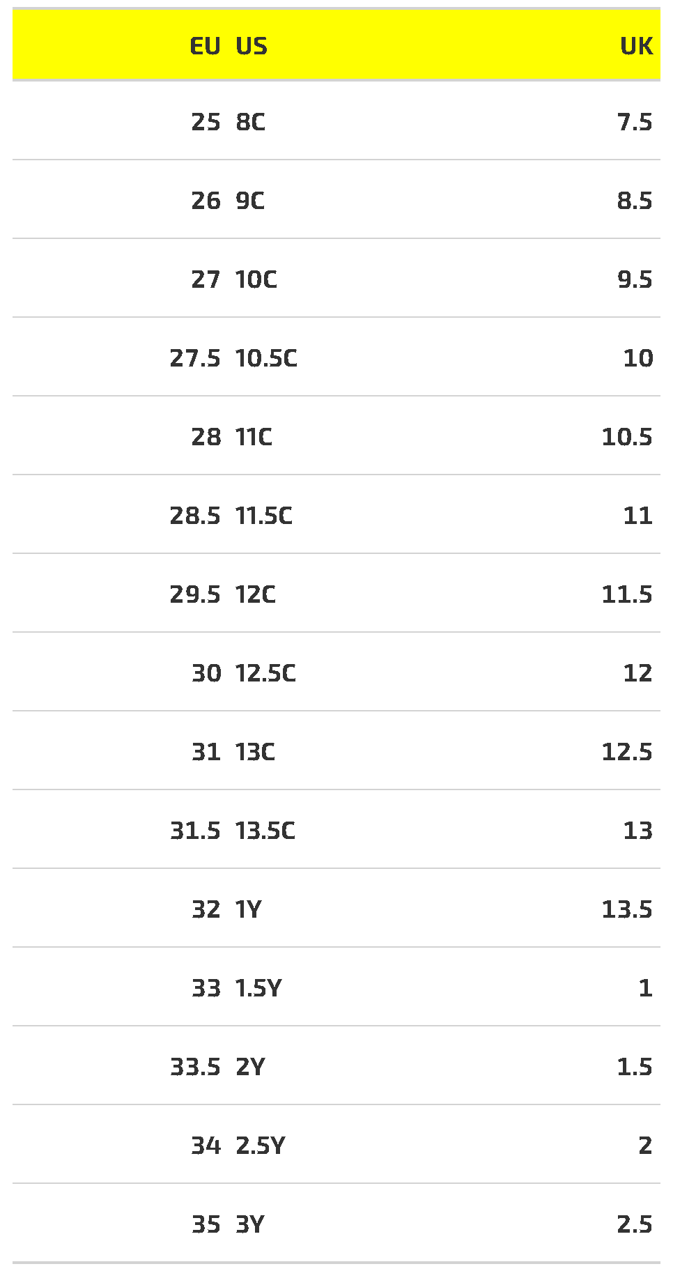 Находим Вашу длину стопы в крайнем правом столбце, далее смотрим на крайний левый столбец и видим, какой Ваш размер EU у данной модели для заказа.