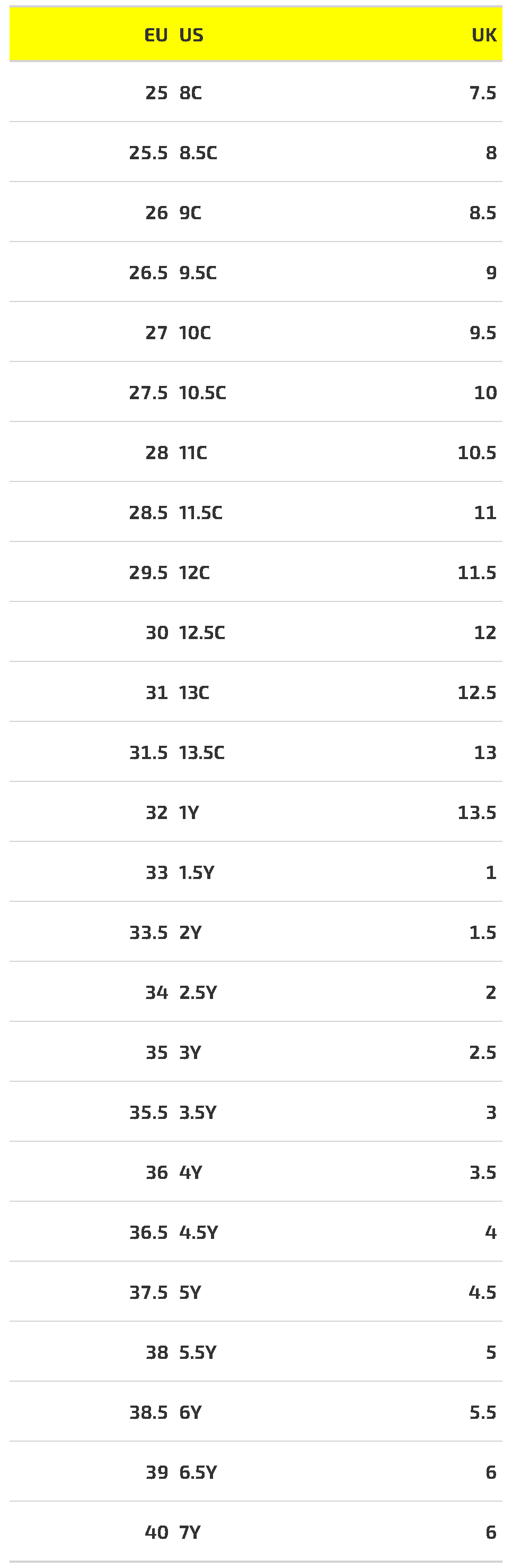 Находим Вашу длину стопы в крайнем правом столбце, далее смотрим на крайний левый столбец и видим, какой Ваш размер EU у данной модели для заказа.