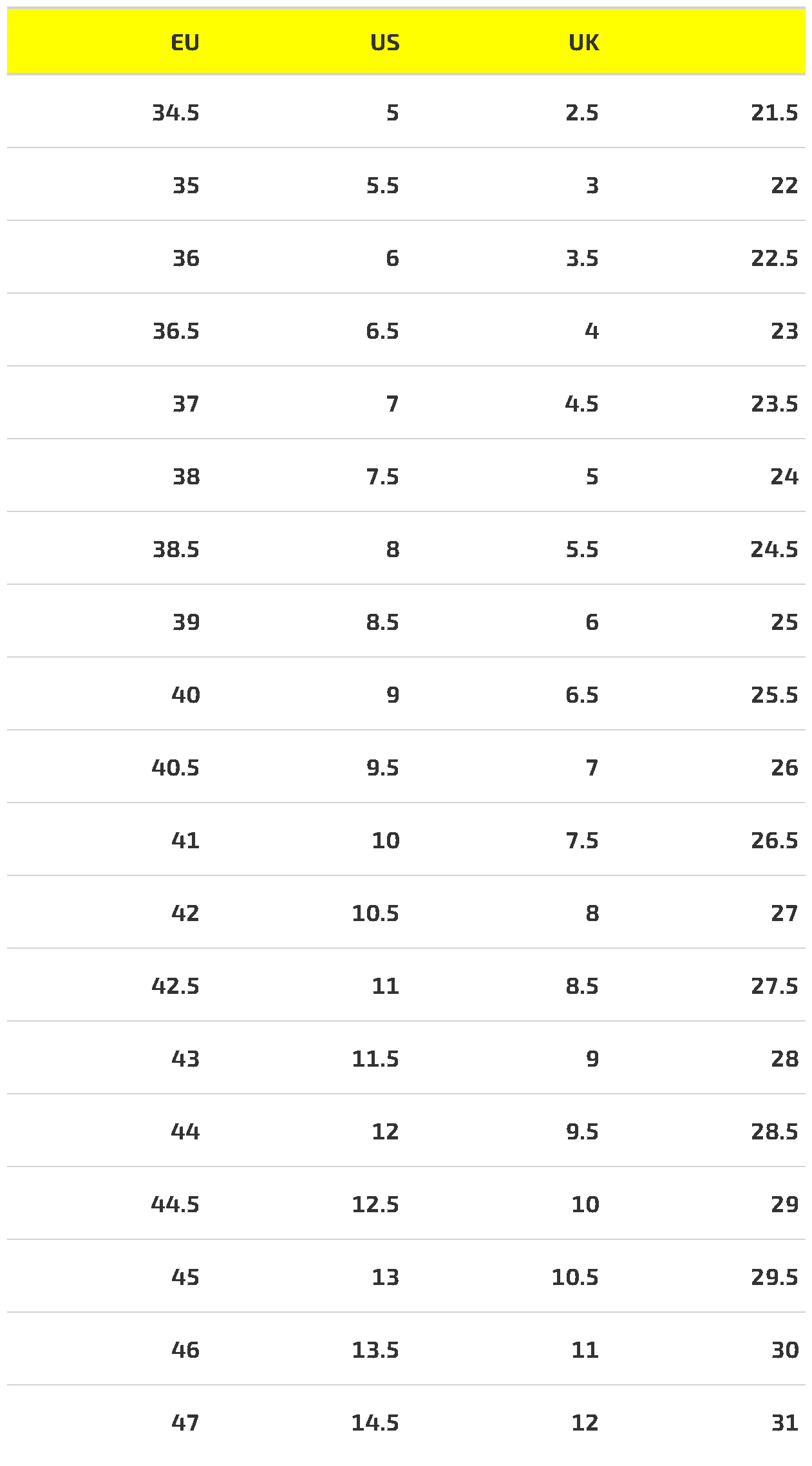 Находим Вашу длину стопы в крайнем правом столбце, далее смотрим на крайний левый столбец и видим, какой Ваш размер EU у данной модели для заказа.