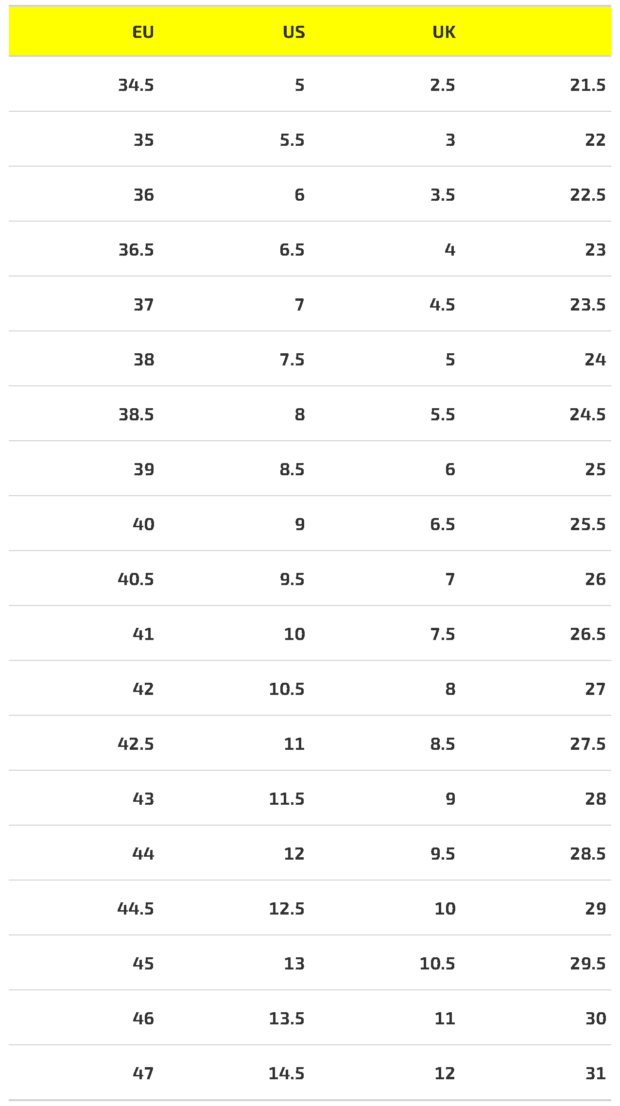 Находим Вашу длину стопы в крайнем правом столбце, далее смотрим на крайний левый столбец и видим, какой Ваш размер EU у данной модели для заказа.