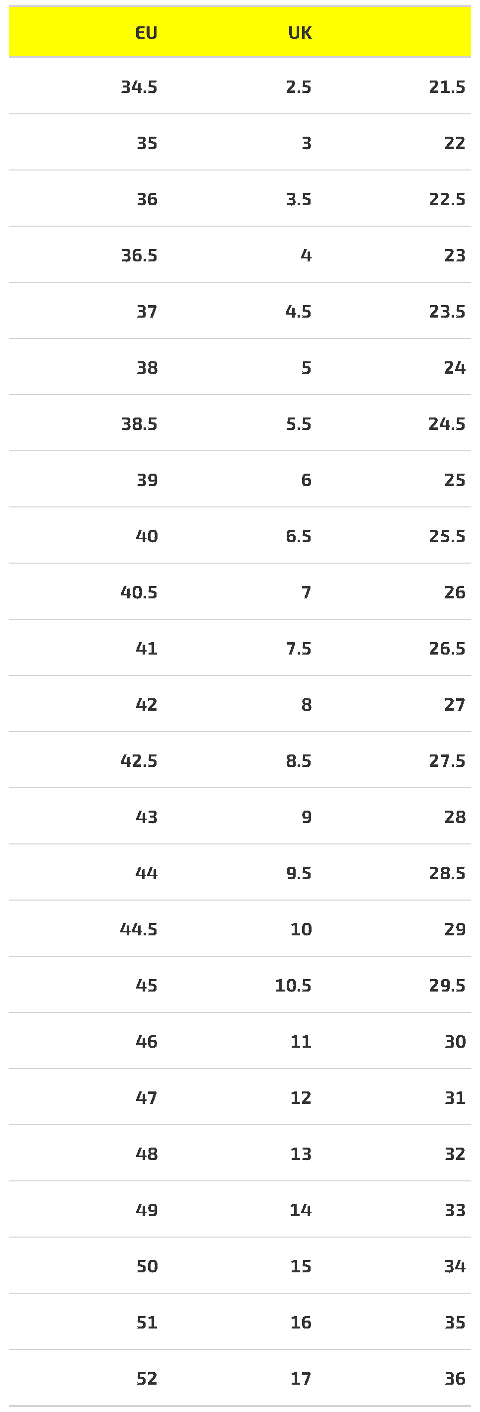 Находим Вашу длину стопы в крайнем правом столбце, далее смотрим на крайний левый столбец и видим, какой Ваш размер EU у данной модели для заказа.