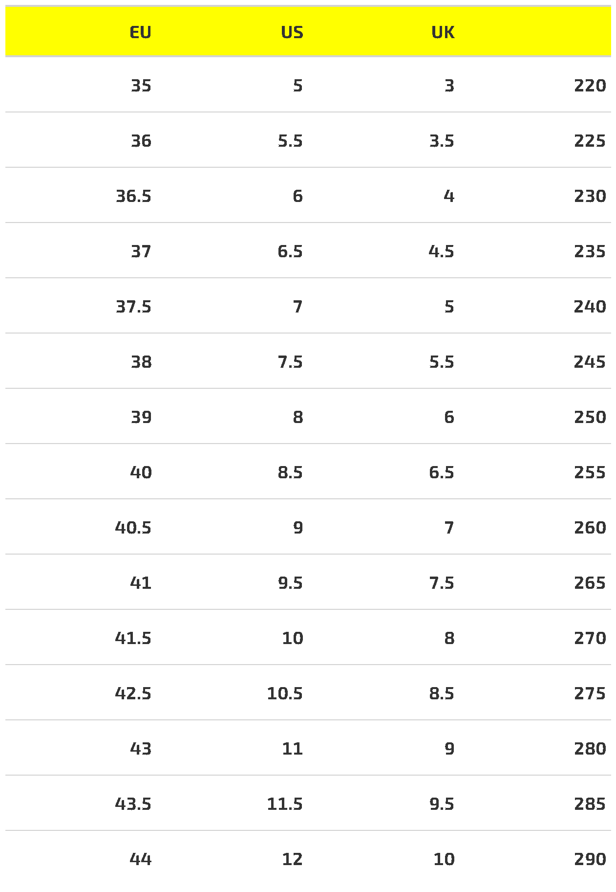 Находим Вашу длину стопы в крайнем правом столбце, далее смотрим на крайний левый столбец и видим, какой Ваш размер EU у данной модели для заказа.