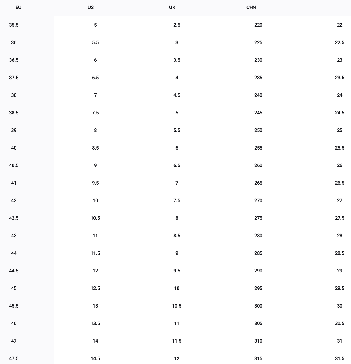 Находим Вашу длину стопы в крайнем правом столбце, далее смотрим на крайний левый столбец и видим, какой Ваш размер EU у данной модели для заказа.