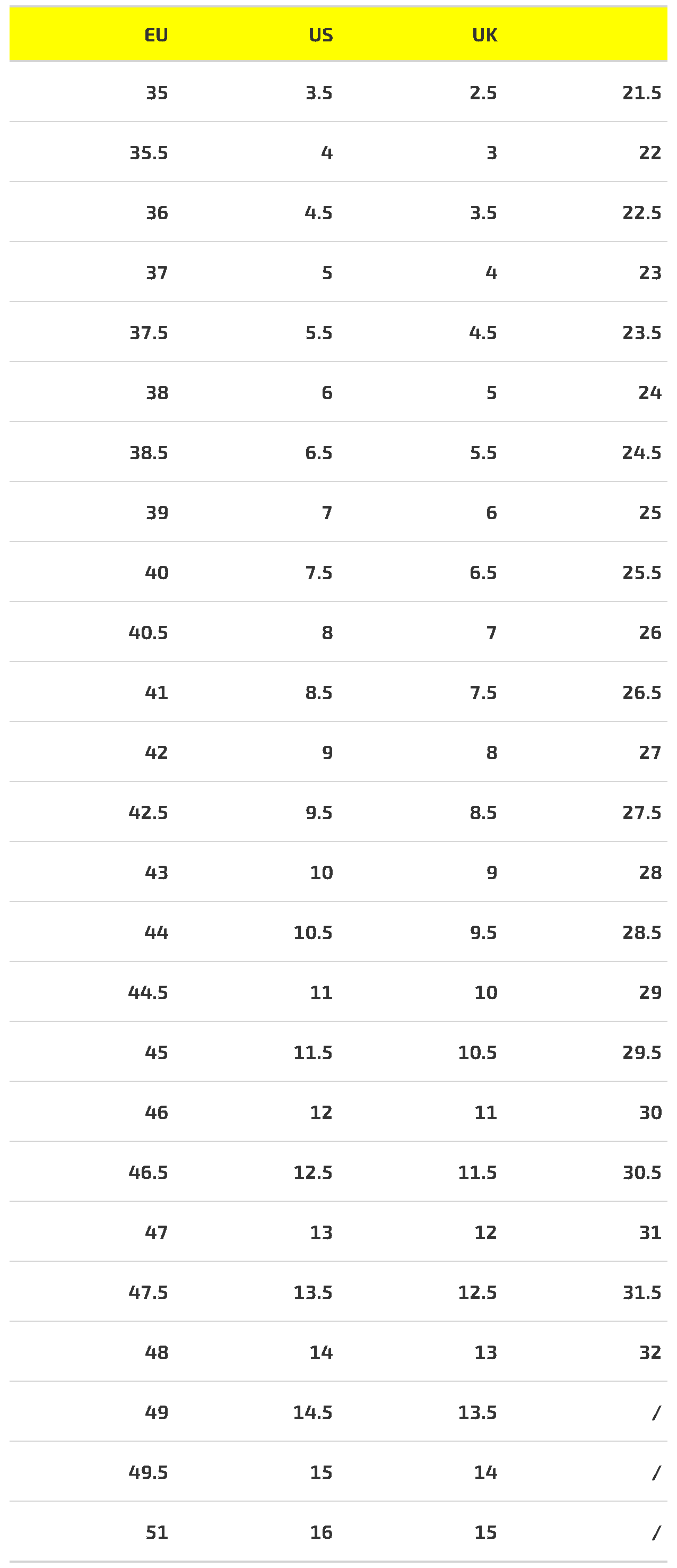 Находим Вашу длину стопы в крайнем правом столбце, далее смотрим на крайний левый столбец и видим, какой Ваш размер EU у данной модели для заказа.
