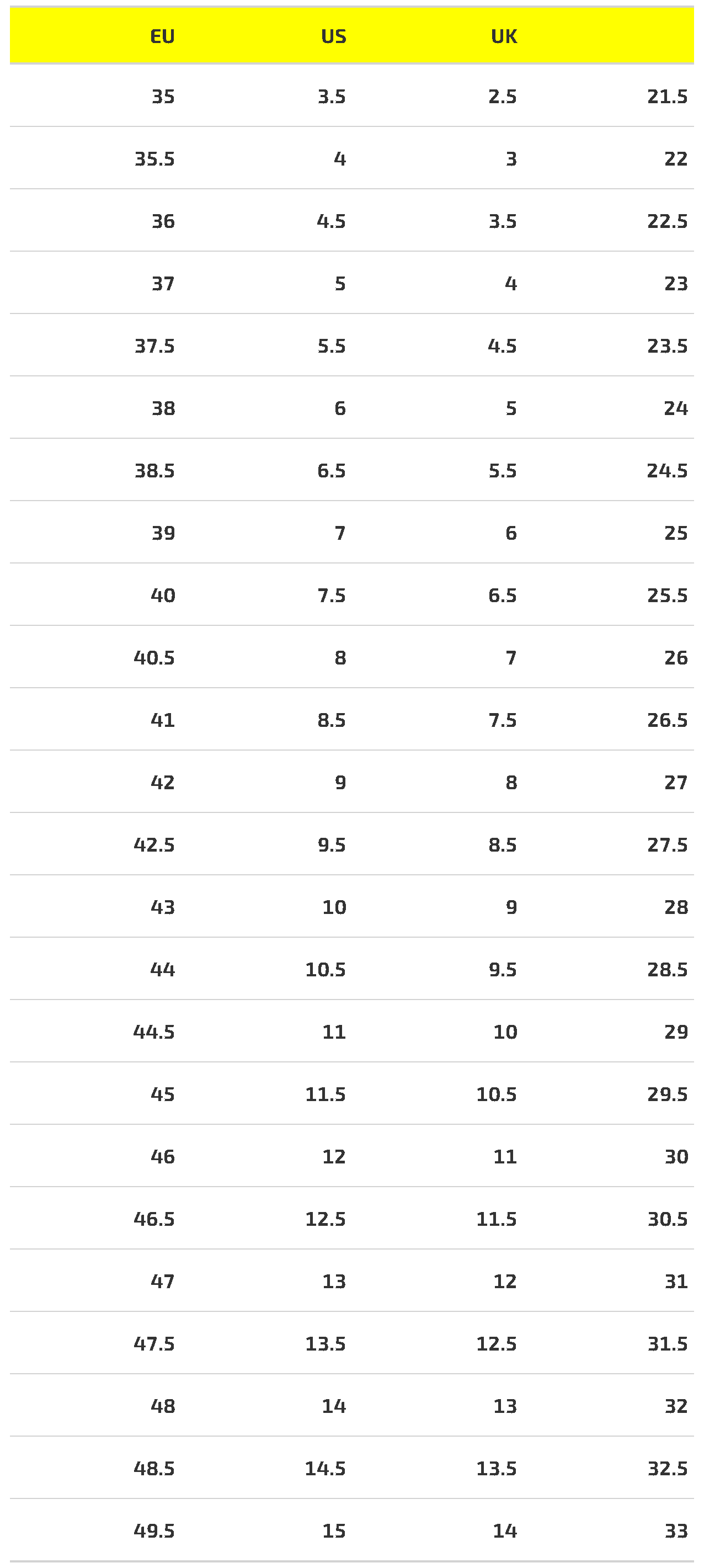 Находим Вашу длину стопы в крайнем правом столбце, далее смотрим на крайний левый столбец и видим, какой Ваш размер EU у данной модели для заказа.