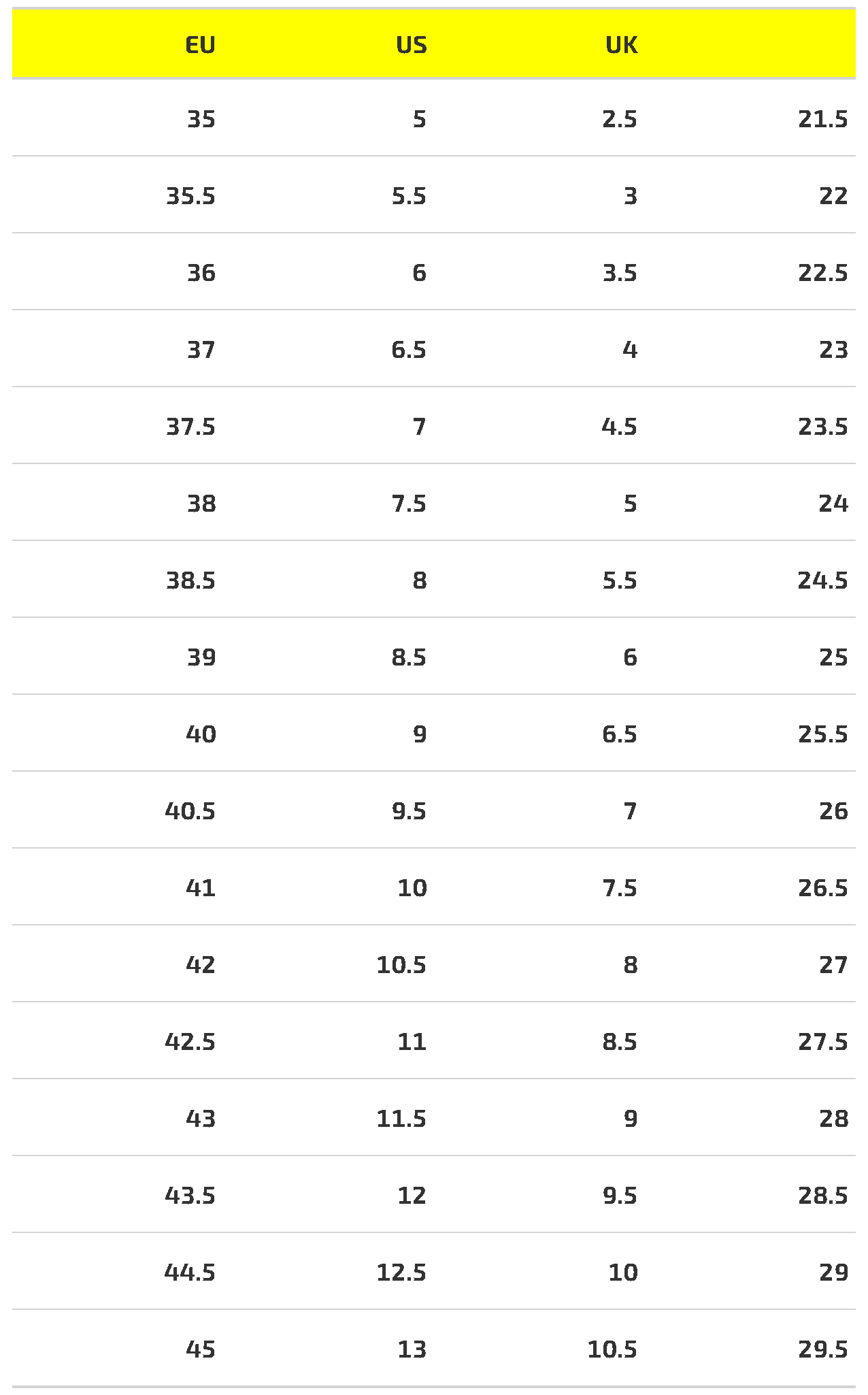 Находим Вашу длину стопы в крайнем правом столбце, далее смотрим на крайний левый столбец и видим, какой Ваш размер EU у данной модели для заказа.