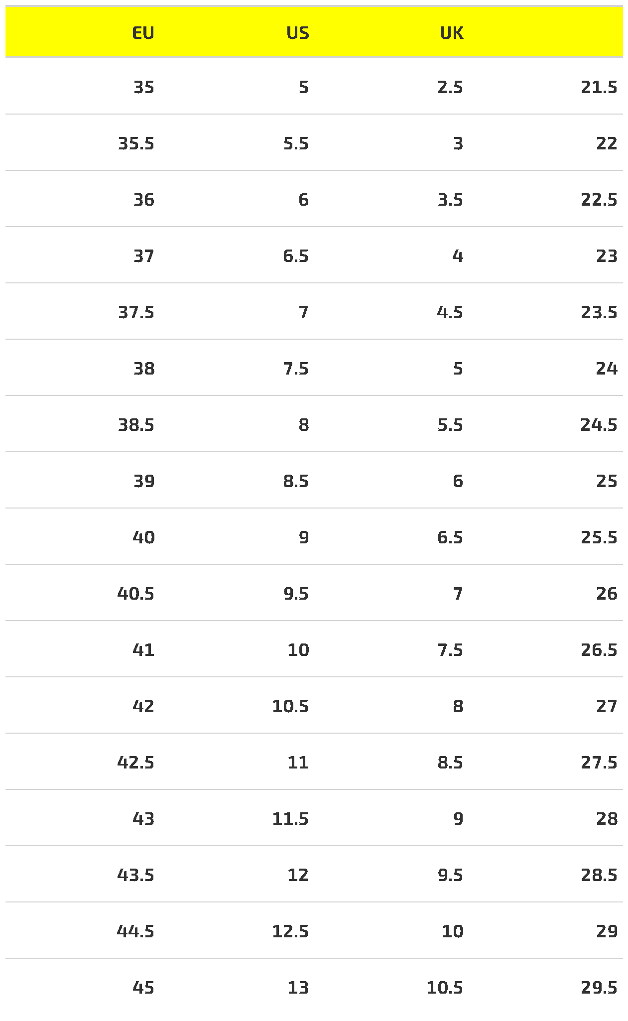 Находим Вашу длину стопы в крайнем правом столбце, далее смотрим на крайний левый столбец и видим, какой Ваш размер EU у данной модели для заказа.
