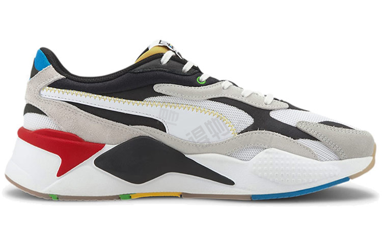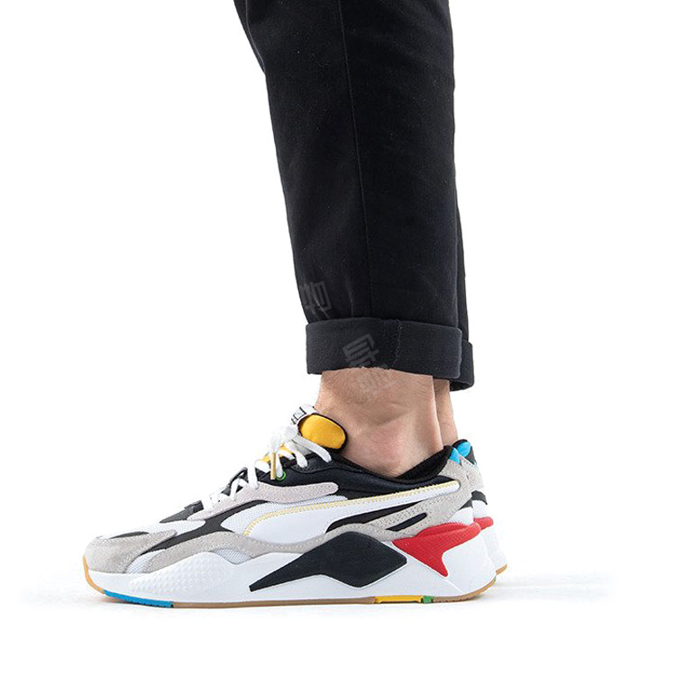 Подошва выполнена из прочной резины с многослойной геометрией и выраженным рисунком протектора, обеспечивающим надёжное сцепление с поверхностью. Благодаря массивной форме подошвы RS-X³ сохраняет современный, модный силуэт, характерный для тренда «dad shoes», но при этом не теряет лёгкости и практичности.