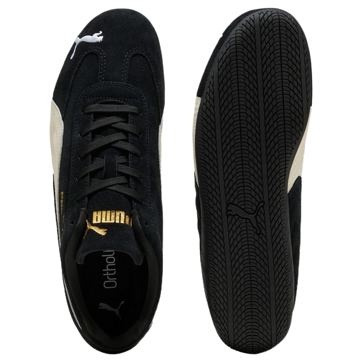 Дизайн Puma Speedcat "Black White" — это сдержанная элегантность и динамика в чистом виде. Белая боковая вставка Formstrip подчёркивает фирменный стиль бренда, а аккуратный логотип Puma Cat на внешней стороне добавляет харизмы. Надпись Puma на язычке завершает облик, сохраняя дух оригинала и делая модель узнаваемой. Каждая деталь продумана: от формы шнуровки до изгибов боковых панелей, — всё служит функциональности и эстетике.