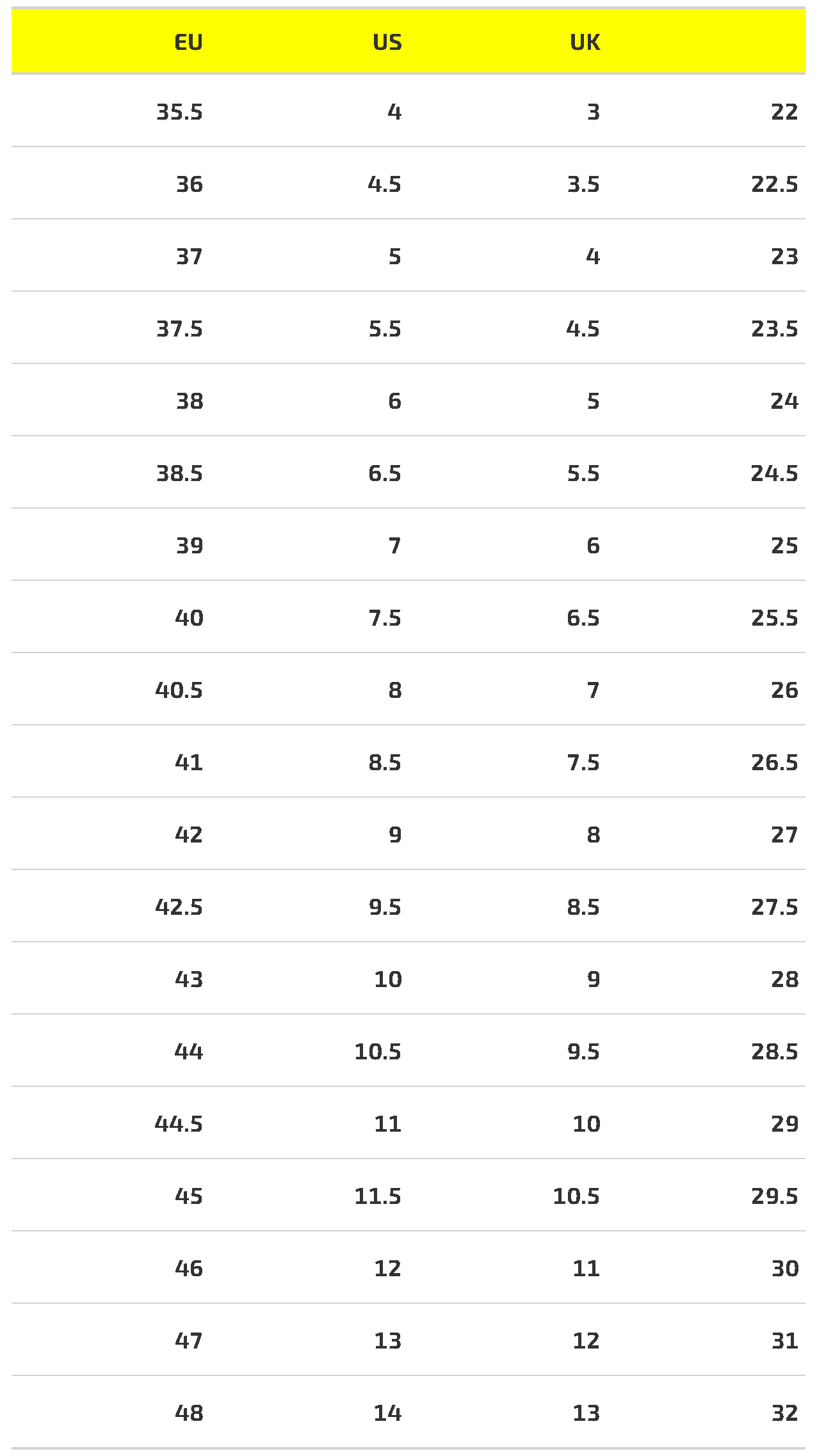 Находим Вашу длину стопы в крайнем правом столбце, далее смотрим на крайний левый столбец и видим, какой Ваш размер EU у данной модели для заказа.