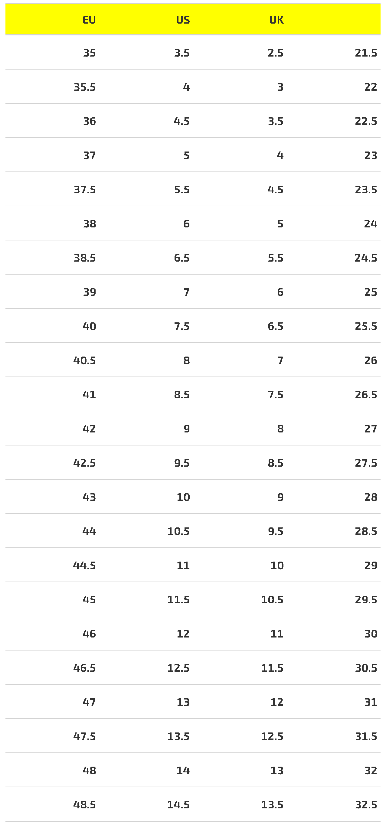 Находим Вашу длину стопы в крайнем правом столбце, далее смотрим на крайний левый столбец и видим, какой Ваш размер EU у данной модели для заказа.