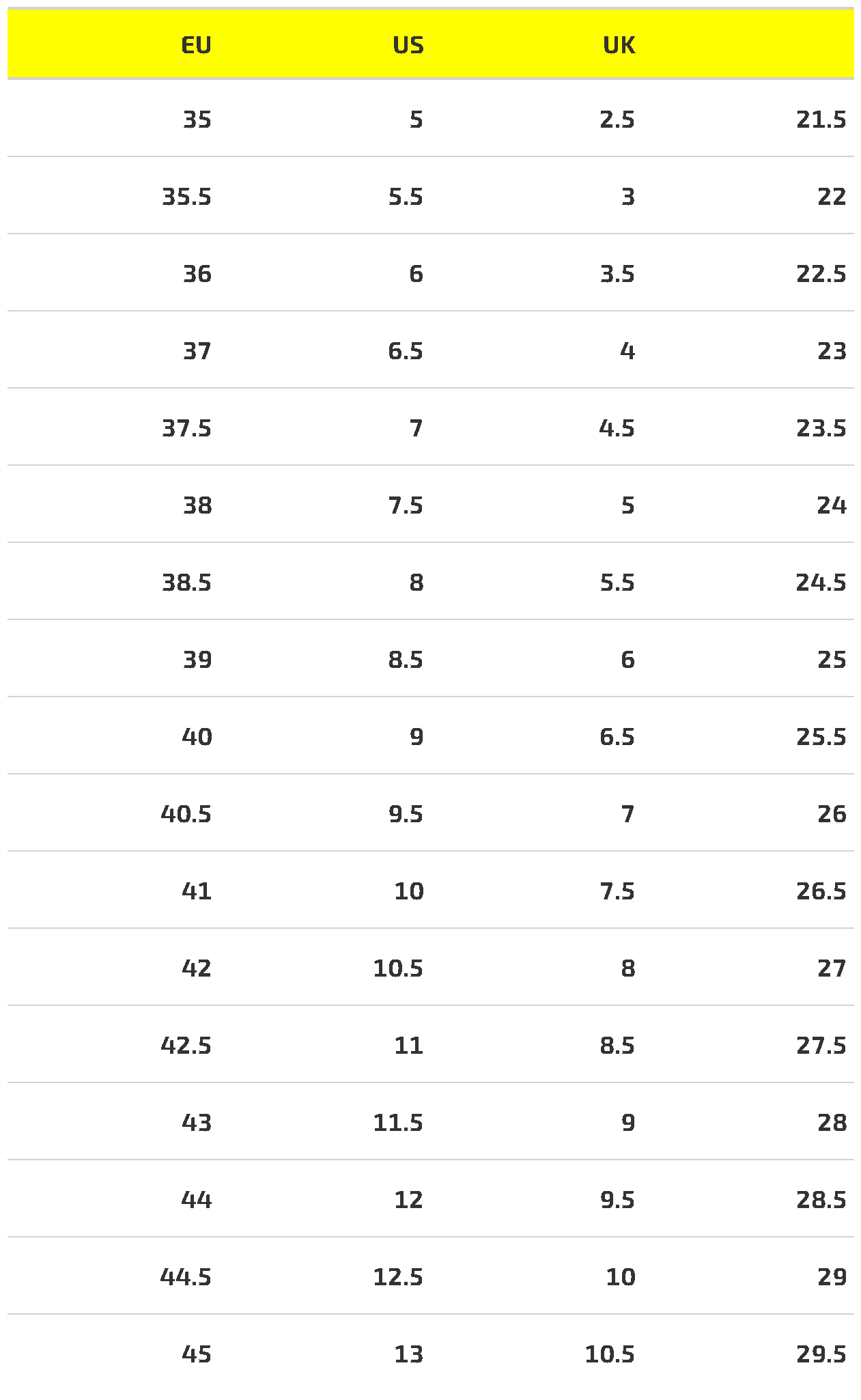 Находим Вашу длину стопы в крайнем правом столбце, далее смотрим на крайний левый столбец и видим, какой Ваш размер EU у данной модели для заказа.