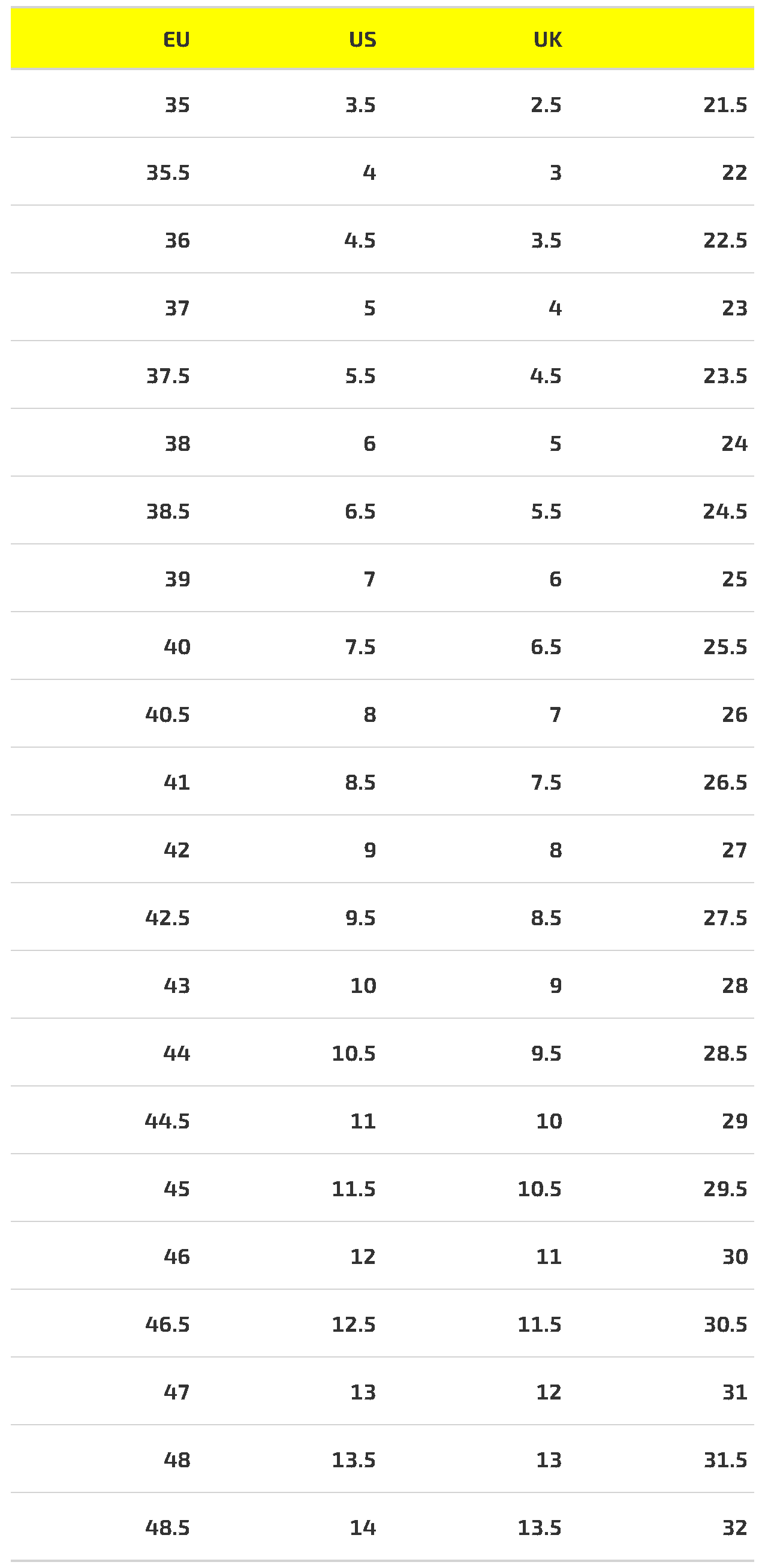Находим Вашу длину стопы в крайнем правом столбце, далее смотрим на крайний левый столбец и видим, какой Ваш размер EU у данной модели для заказа.