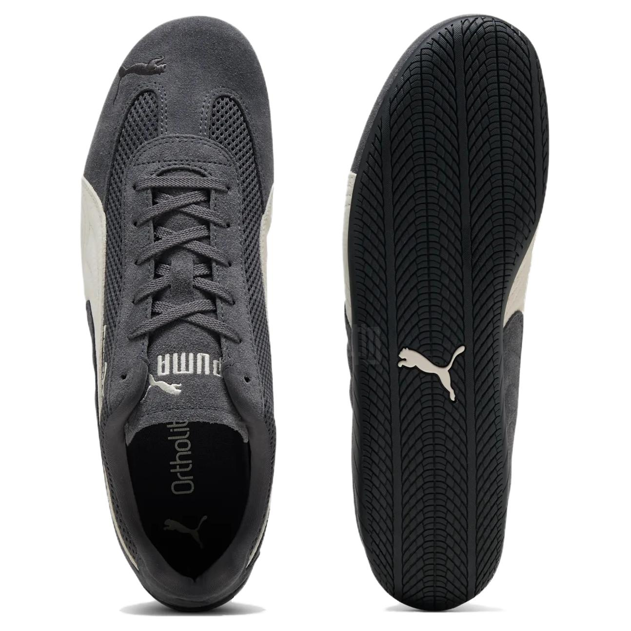 Аэродинамичный силуэт и низкий профиль — ключевые особенности серии Speedcat, вдохновлённой профессиональной обувью пилотов Формулы-1. Узкий носок и обтекаемые линии создают стремительный, вытянутый силуэт, придающий обуви динамичный и спортивный характер. При этом дизайн остаётся лаконичным и универсальным, что делает модель уместной в любых повседневных образах.