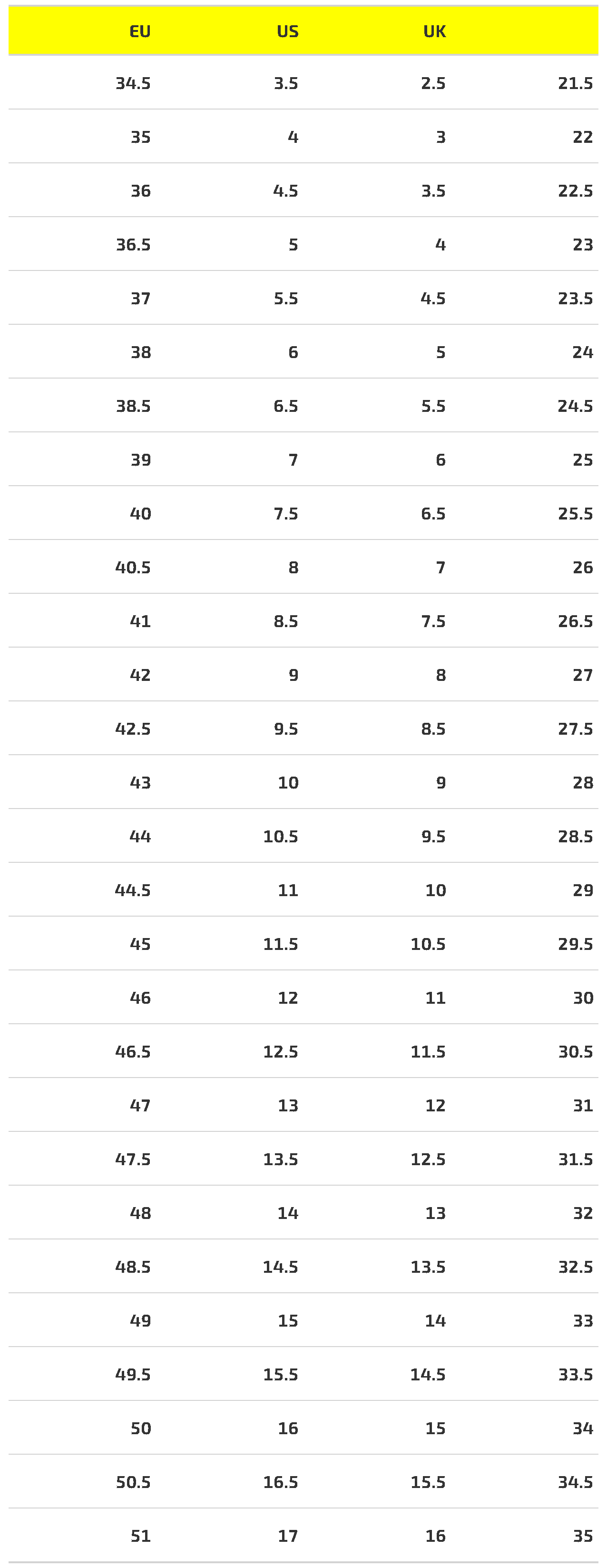 Находим Вашу длину стопы в крайнем правом столбце, далее смотрим на крайний левый столбец и видим, какой Ваш размер EU у данной модели для заказа.