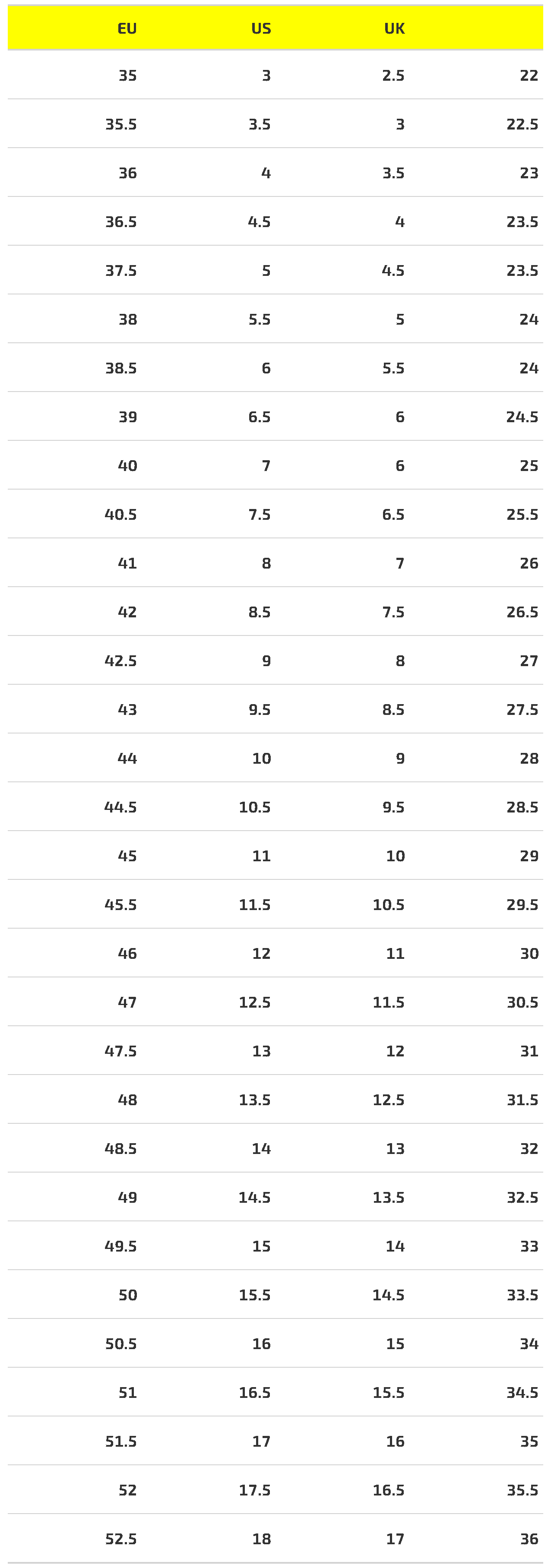 Находим вашу длину стопы в крайнем правом столбце, далее смотрим на крайний левый столбец и видим, какой ваш размер EU у данной модели для заказа.