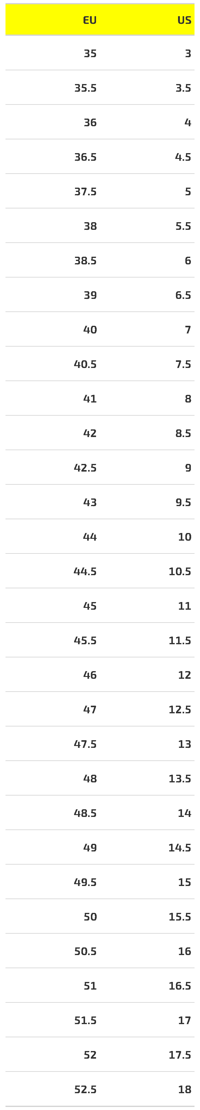 Находим вашу длину стопы в крайнем правом столбце, далее смотрим на крайний левый столбец и видим, какой ваш размер EU у данной модели для заказа.
