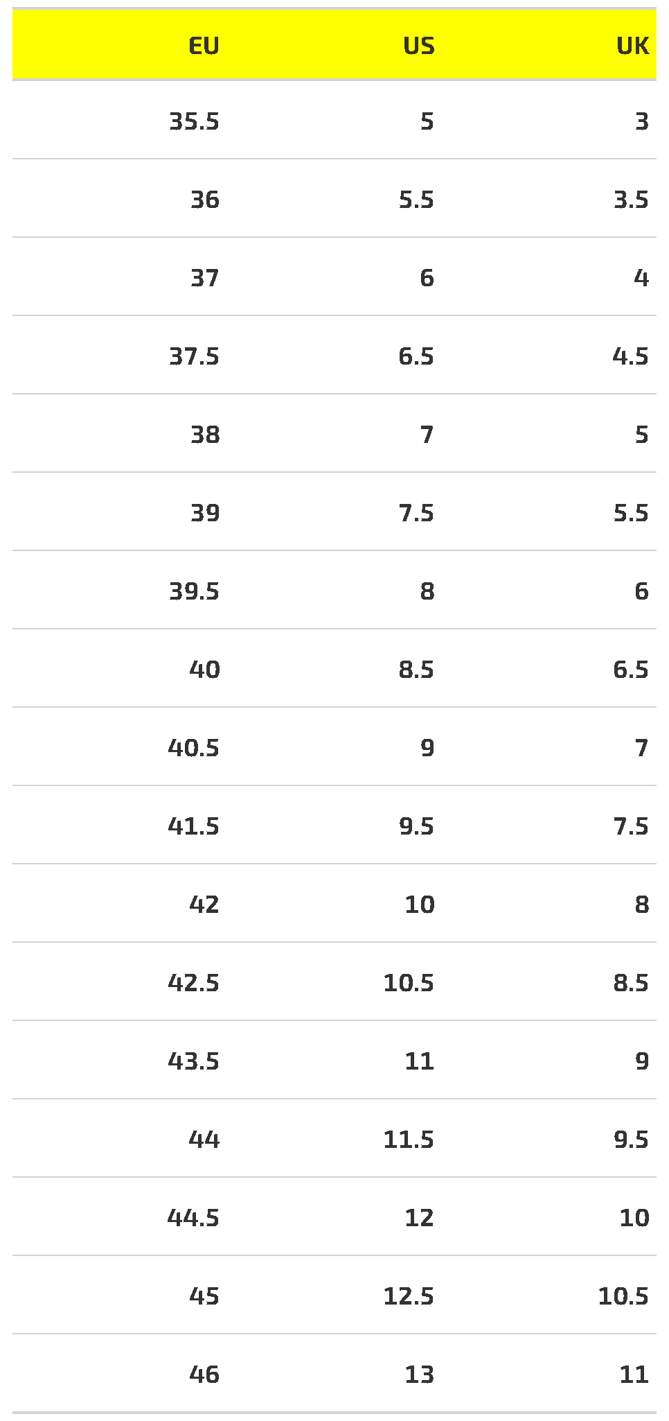 Находим вашу длину стопы в крайнем правом столбце, далее смотрим на крайний левый столбец и видим, какой Ваш размер EU у данной модели для заказа.