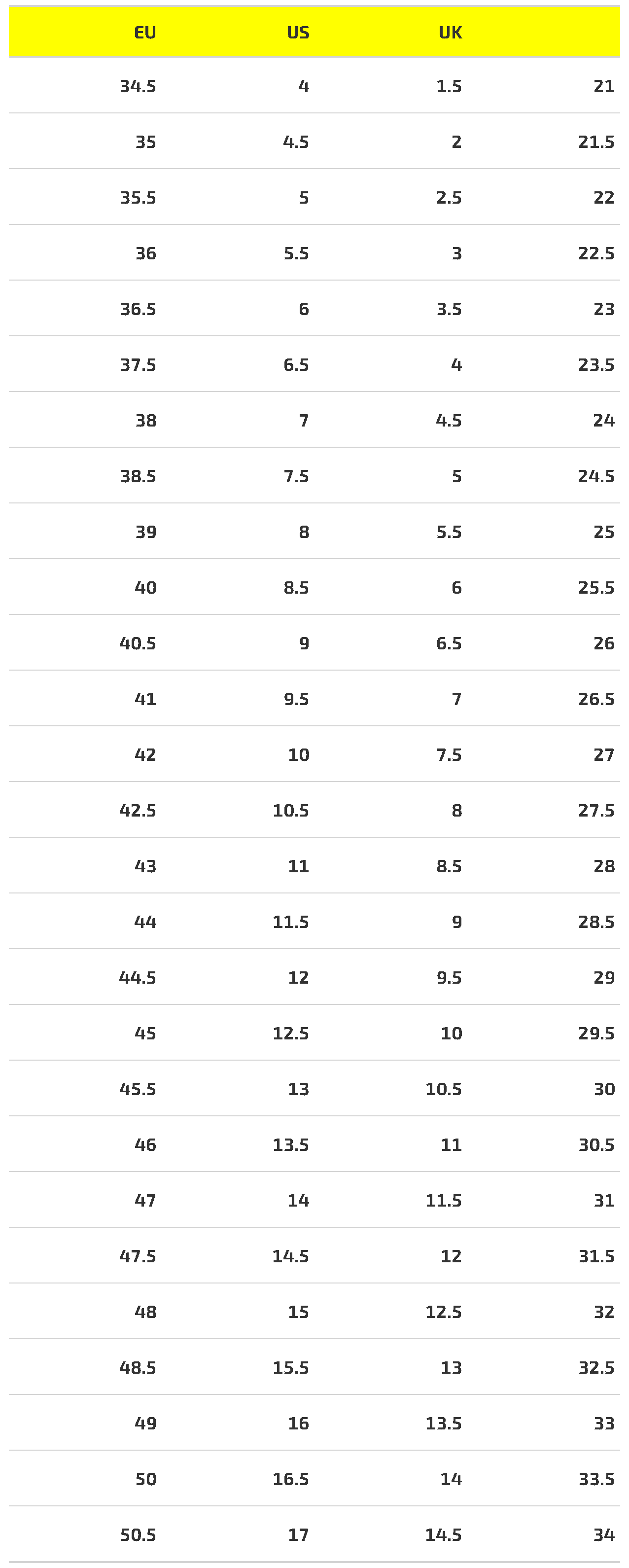 Находим вашу длину стопы в крайнем правом столбце, далее смотрим на крайний левый столбец и видим, какой ваш размер EU у данной модели для заказа.