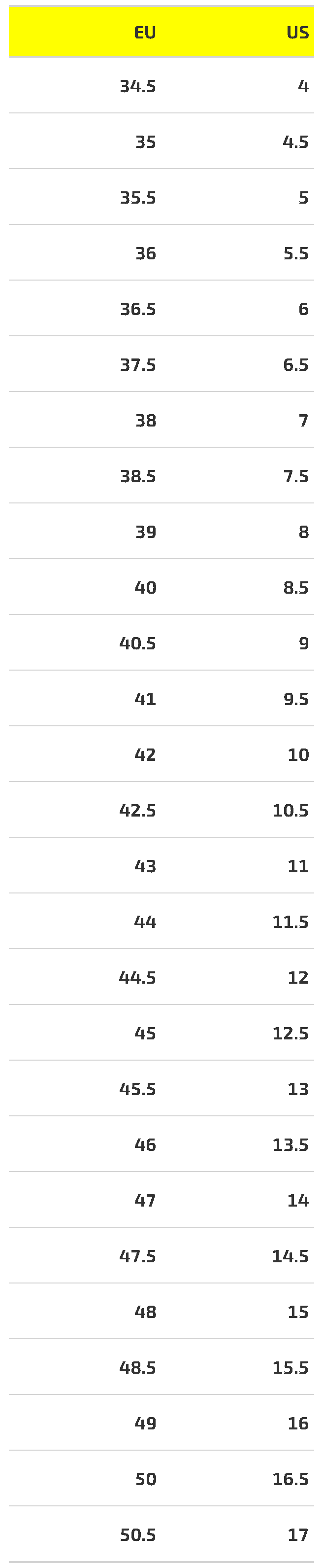 Находим вашу длину стопы в крайнем правом столбце, далее смотрим на крайний левый столбец и видим, какой ваш размер EU у данной модели для заказа.