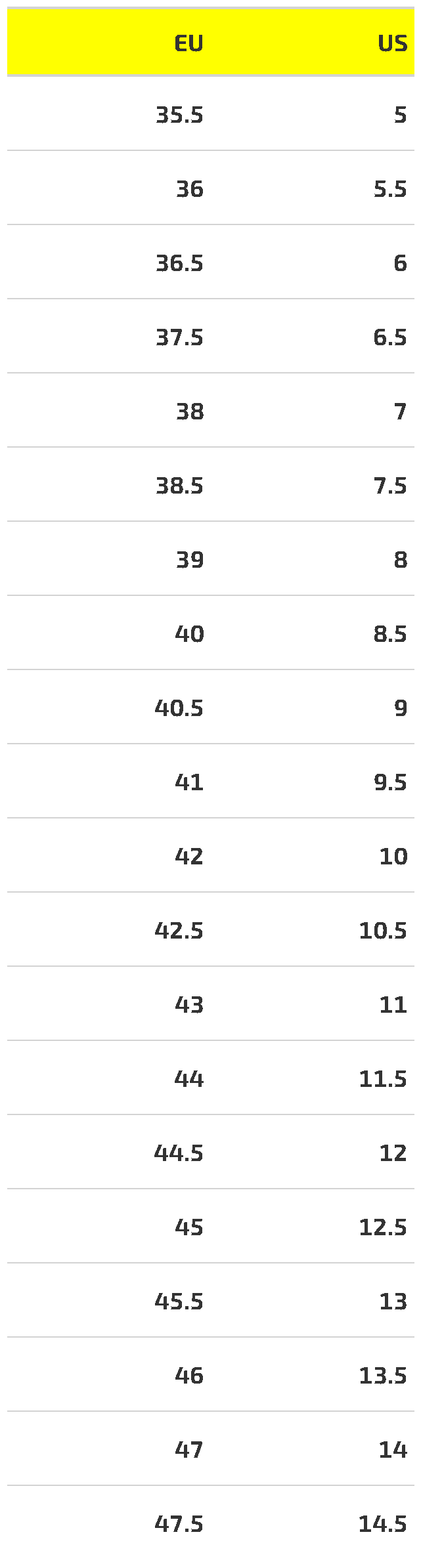 Находим вашу длину стопы в крайнем правом столбце, далее смотрим на крайний левый столбец и видим, какой ваш размер EU у данной модели для заказа.