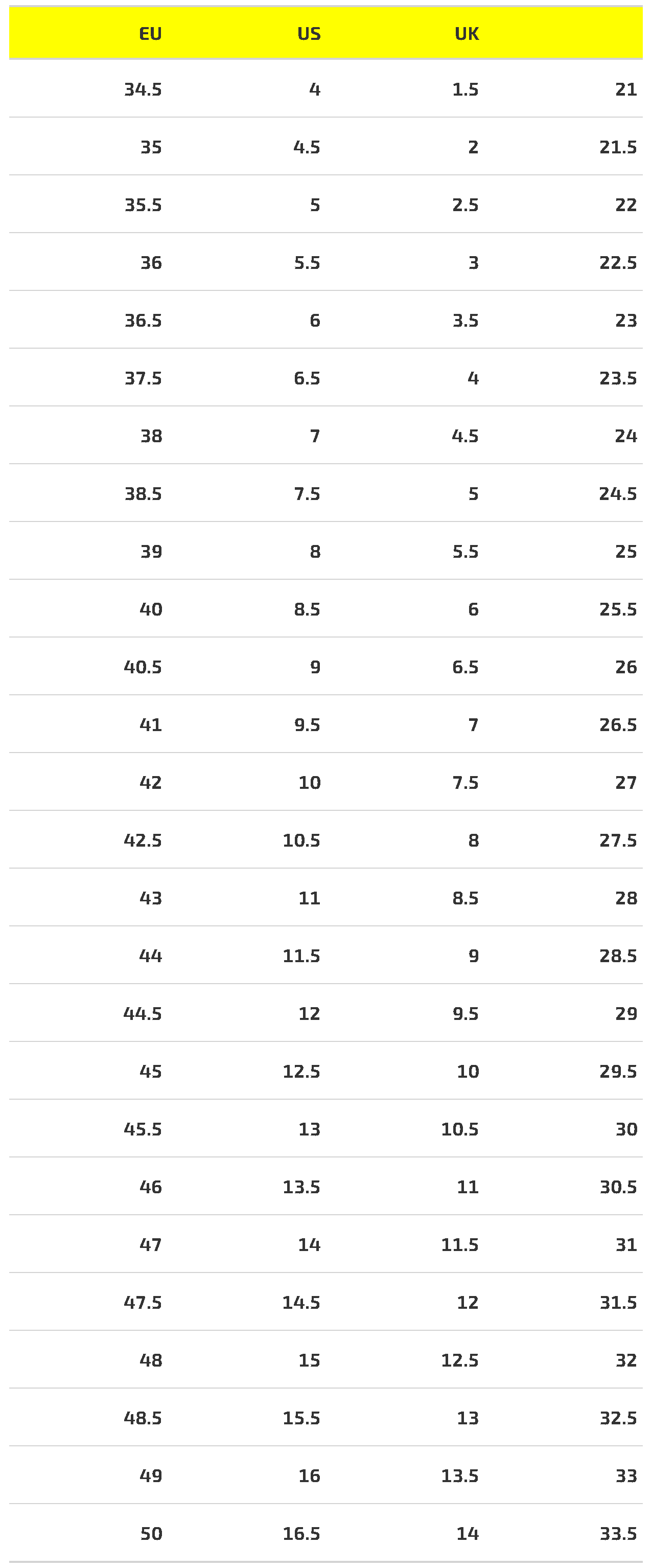 Находим вашу длину стопы в крайнем правом столбце, далее смотрим на крайний левый столбец и видим, какой ваш размер EU у данной модели для заказа.